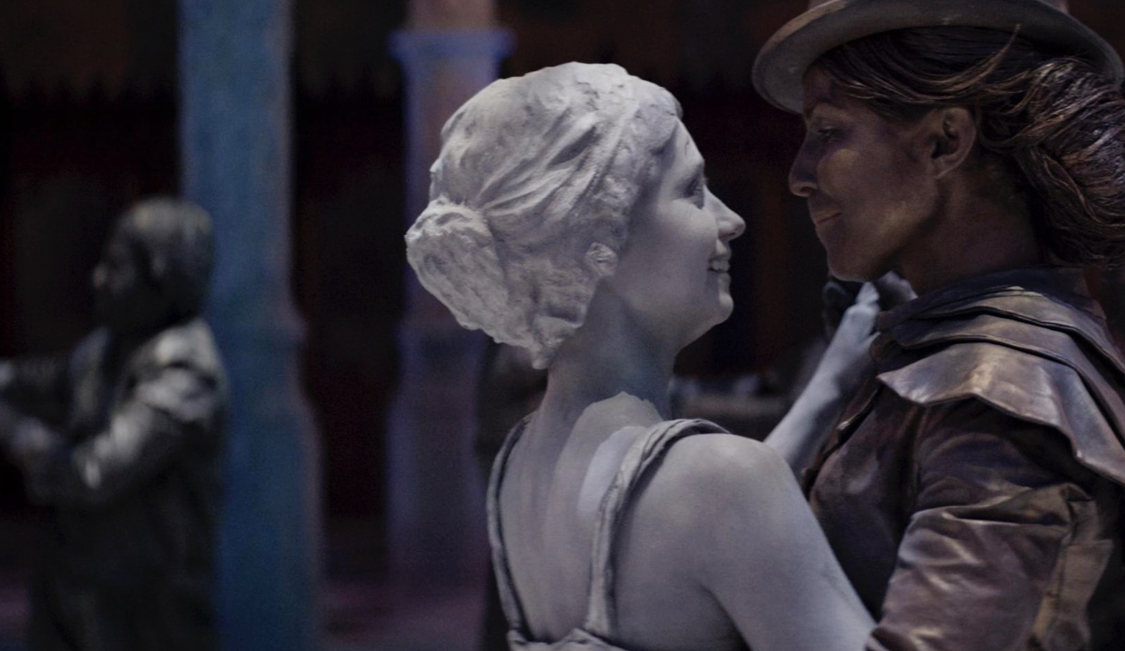 In a sculpture park in the heart of a bustling metropolis, Paula, a lonely street artist, entertains people as a living statue. She longs with an impossible love for a stone sculpture next to her regular spot. One day she is dismayed to find her stone companion replaced by a new, modern sculpture. After a frantic search, she finds the sculpture in a group of discarded statues, ready to be taken away. Almost as a farewell, she kisses the object of her affection. Later, at the festival’s closing party, Paula meets Agatha in the flesh.