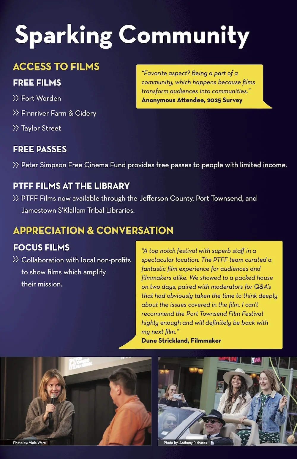 Because of our generous donors like you, PTFF is able to support local film production, connect Port Townsend to the national diversity of filmmakers, and spark community throughout the year. In this time of division and struggle, these relationships and opportunities to share stories with one another mean more than they ever have.